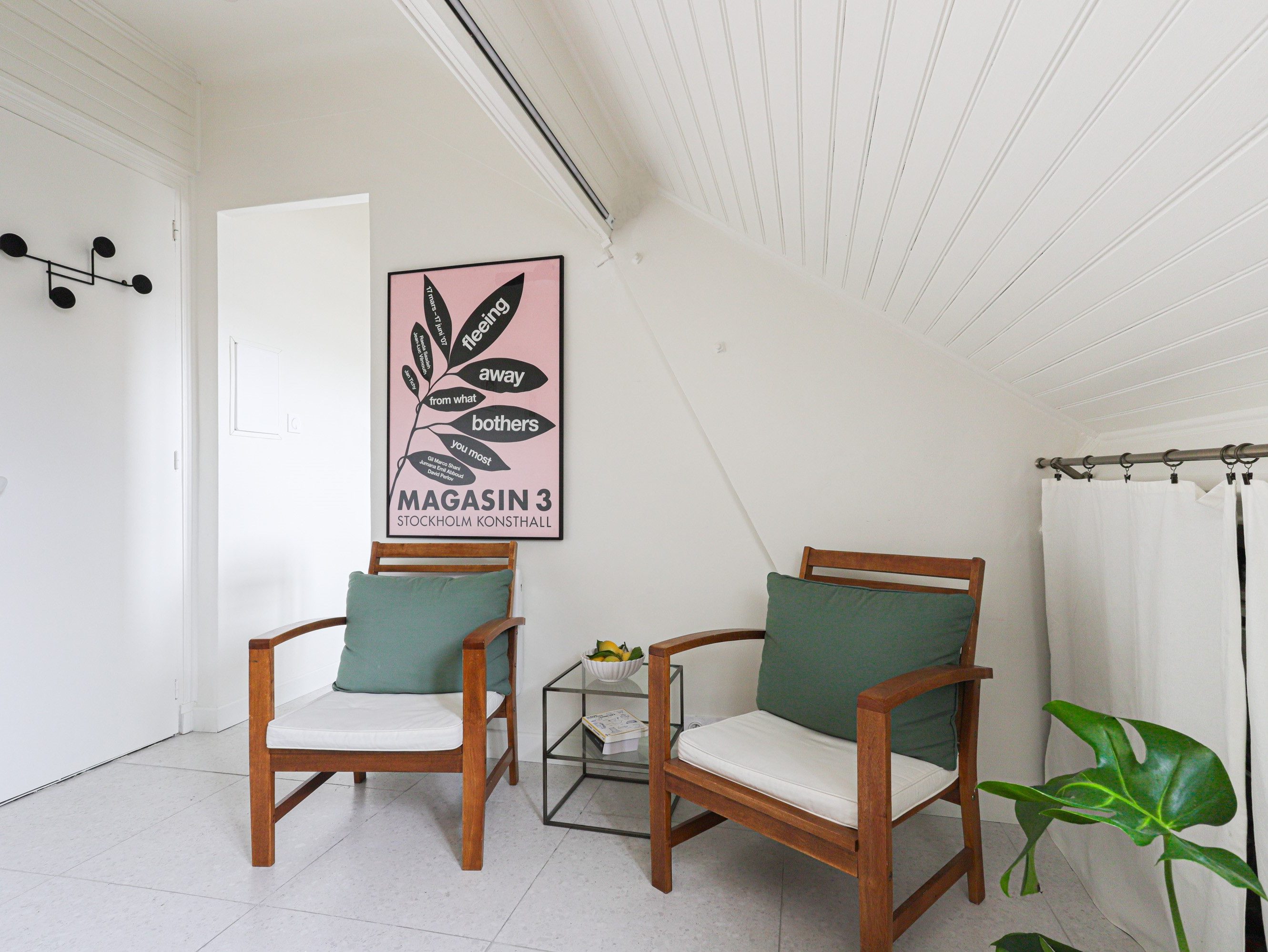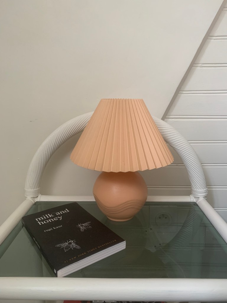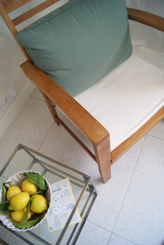 - La plupart du mobilier a été chiné en état neuf ou quasi neuf sur Leboncoin et Selency : tables de chevet, lampes de chevet plissées, fauteuils et table salon, chaises hautes, matelas,… Idem pour l’électro-ménager : machine à café, bouilloire, micro-ondes,…