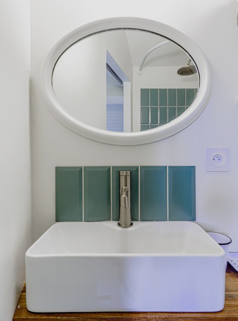 - La salle de bain a également dû être totalement refondue : chaque m2 comptant, la cloison a été dessinée en biais de manière à rajouter l’espace nécessaire à l’ajout d’un petit lavabo et douche confortable, sans empiéter sur la cuisine
