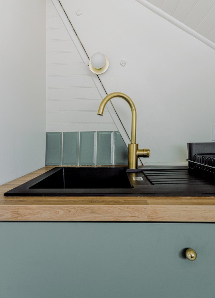 - Cet écrin blanc a été structuré par des touches de vert de gris et de noir que l’on retrouve dans toutes les pièces : cuisine basse, carrelage, linge de lit, porte-manteaux, ventilateur au plafond… Le tout est également réchauffé par du bois (plan de travail sur-mesure dans la cuisine et la salle de bain, mobilier,…), du rose/terracotta (décoration), du laiton (mitigeurs, colonne de douche, poignées de cuisine Bulle de Plum living …)