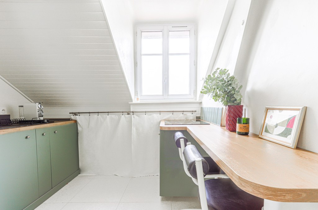 - La cuisine a été revue complètement de manière à être plus fonctionnelle : exit les 2 petits meubles sous pente avec des plaques de cuisson inaccessibles. Place à une cuisine en disposition parallèle, avec des plaques de cuisson positionnées devant de la fenêtre chien-assis. Le plan de travail sur-mesure épouse les jambes de forces de la structure de la toiture et se poursuit naturellement en table / espace de travail. Les rangements sont les combles sont facilement accessibles avec des rideaux, pour stocker les éléments volumineux (balais, aspirateurs,…)