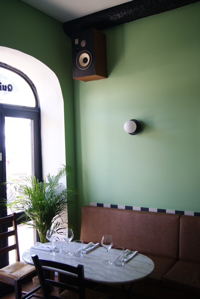 - C’est donc un mélange de classique et de décalé qui a été proposé par STUDIO MONCAUT : le côté « rustique » des tomettes au sol et des poutres au plafond, côtoie un vert Cardère à la fois doux et joyeux aux murs. Pour contraster avec cette couleur atypique et renforcer l’esprit bistrot, du marron foncé a été apporté sur les banquettes (structure et coussins effet cuir) et du noir mat vers le bar et dans l’arrière salle. Les tables en marbre dispatchées dans la salle ramènent à des codes classiques, là où les affiches, bibelots et maillots de foot s’en éloignent.
